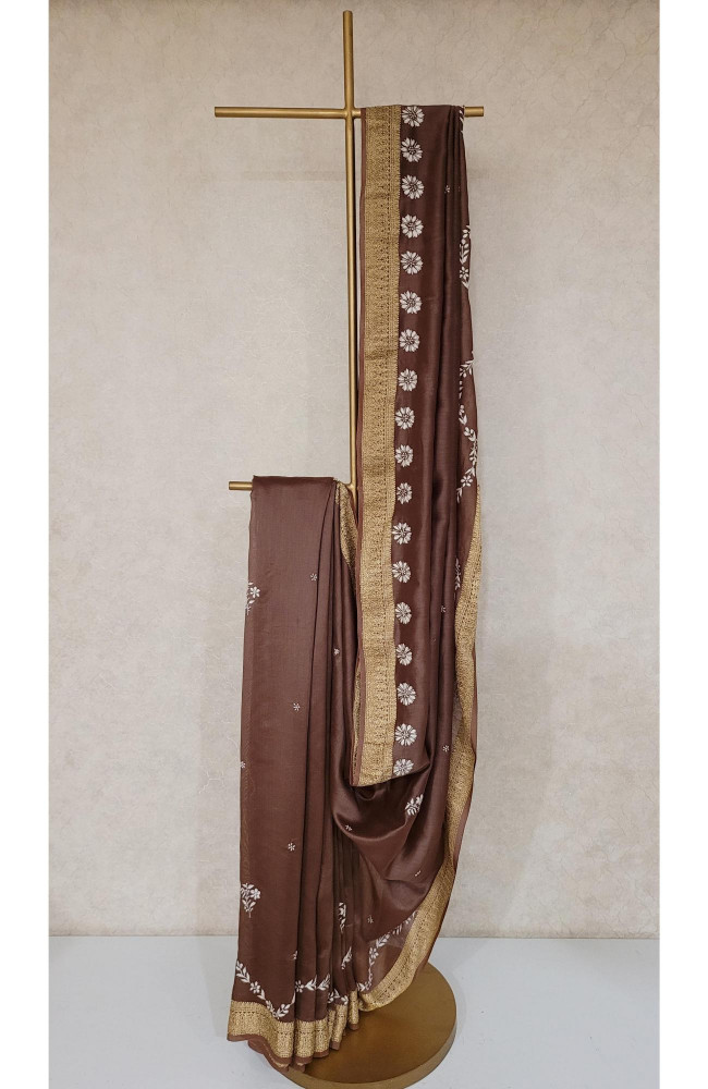 Brown Chanderi Silk Chikankari Saree