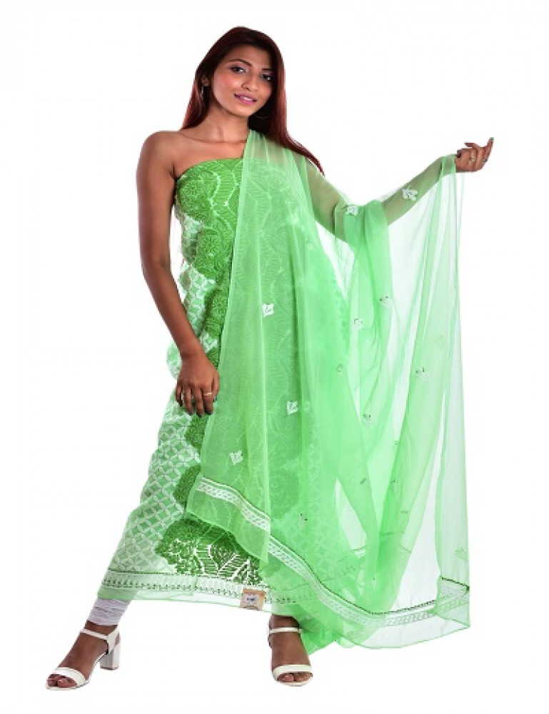 Lucknow Chikan unstitched georgette suit length is well crafted pastel colour unstitched georgette suit. This set consists of a kurta length 3mts with all over jaal chikankari work with cotton thread, salwar offering light chikan work on it's hem and a pure georgette dupatta 2.5mts with some little embroidery with cotton thread. This suit piece is a good wear to offices and other formal as well as casual events. This suit will add more charm and elegance to your personality.