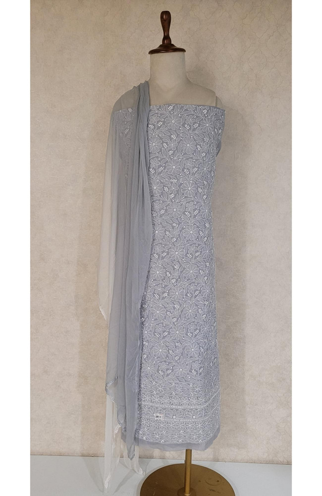 Rohia By Chhangamal Hand Embroidered unstitched Cotton suit length is well crafted Grey colour unstitched Cotton suit. This set consists of a kurta length 46 Inches with Front all over jaal chikankari work with Anchor thread, salwar offering light chikan work on it's hem and a Chiffon dupatta 2.5mts with some little embroidery with Anchor thread. This suit piece is a good wear to offices and other formal as well as casual events. This suit will add more charm and elegance to your personality