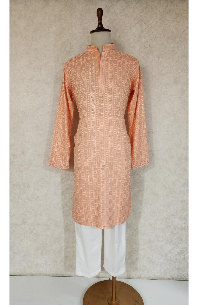 Rohia By Chhangamal Rayon Hakoba work, Mendarine collar design along with buttons placed on the neck placket runs on the kurta. The colour, Hakoba and fabric of the kurta offer a relaxed Fit and comfort to the wearer.