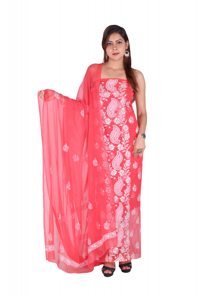 Lucknow Chikan unstitched georgette suit length is well crafted pastel colour unstitched georgette suit. This set consists of a kurta length 3mts with all over jaal chikankari work with cotton thread, salwar offering light chikan work on it's hem and a pure georgette dupatta 2.5mts with some little embroidery with cotton thread. This suit piece is a good wear to offices and other formal as well as casual events. This suit will add more charm and elegance to your personality.
