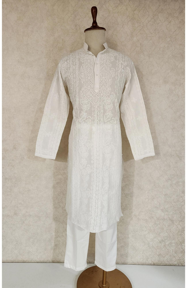 Rohia By Chhangamal Hand Embroidered Cotton Chikankari Men's Kurta, intricate with Bakhiya, Phanda work, Mendarine collar design along with buttons placed on the neck placket runs on the kurta. The colour, embroidery and fabric of the kurta offer a relaxed Fit and comfort to the wearer