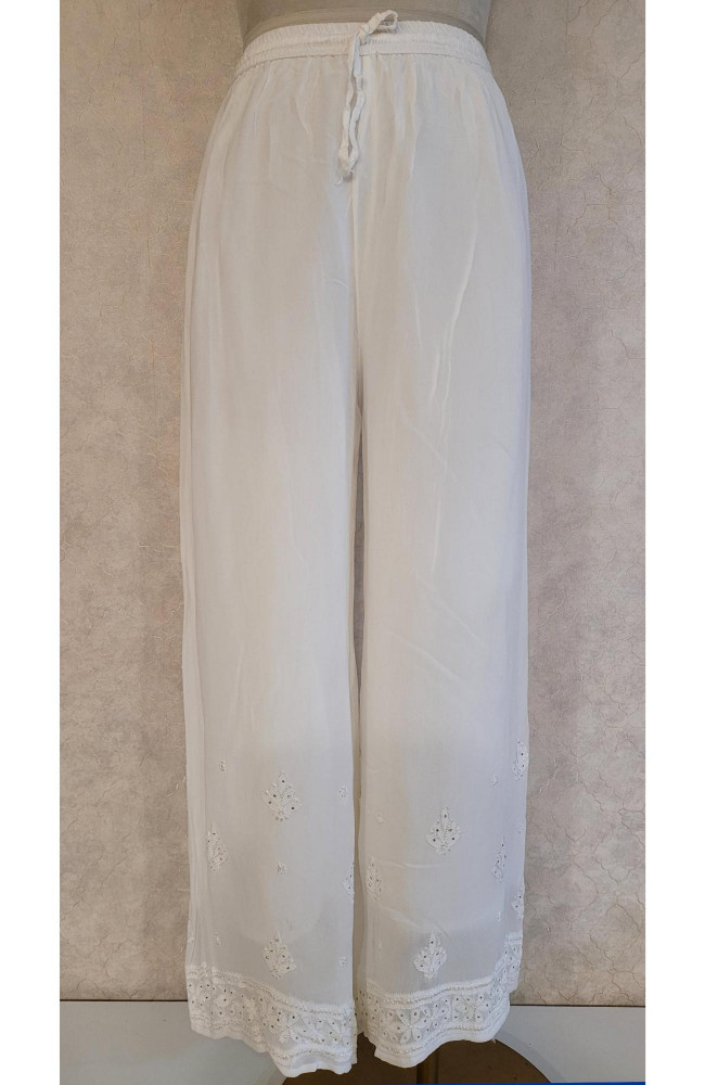 Rohia By Chhangamal Hand Embroidered Pure Georgette Chikankari Hand Crafted Light Weight Palazo with Lining in Bakhiya & Muqaish Work. This is perfect for Casual Summer Wear. This White Pure Georgette Chikankari Palazo is Soft and Comfortable. You Can Wear it in casual as well as formal, pair it with a chikankari kurti & Short Top.